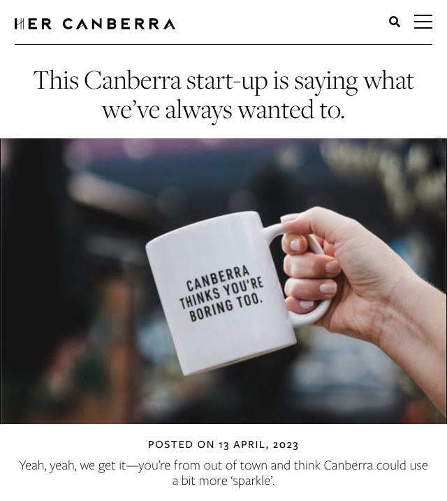 "There’s so much more happening in your hometown, apparently, and you’re keen to tell everyone about it. Enter: the easy way to tell someone to ‘Say less, mate’—the ‘Canberra thinks you’re boring too‘ mugs and t-shirts from North/South Print Shop."