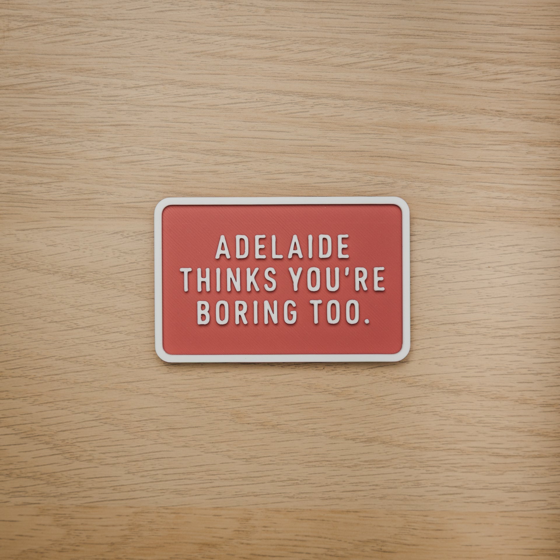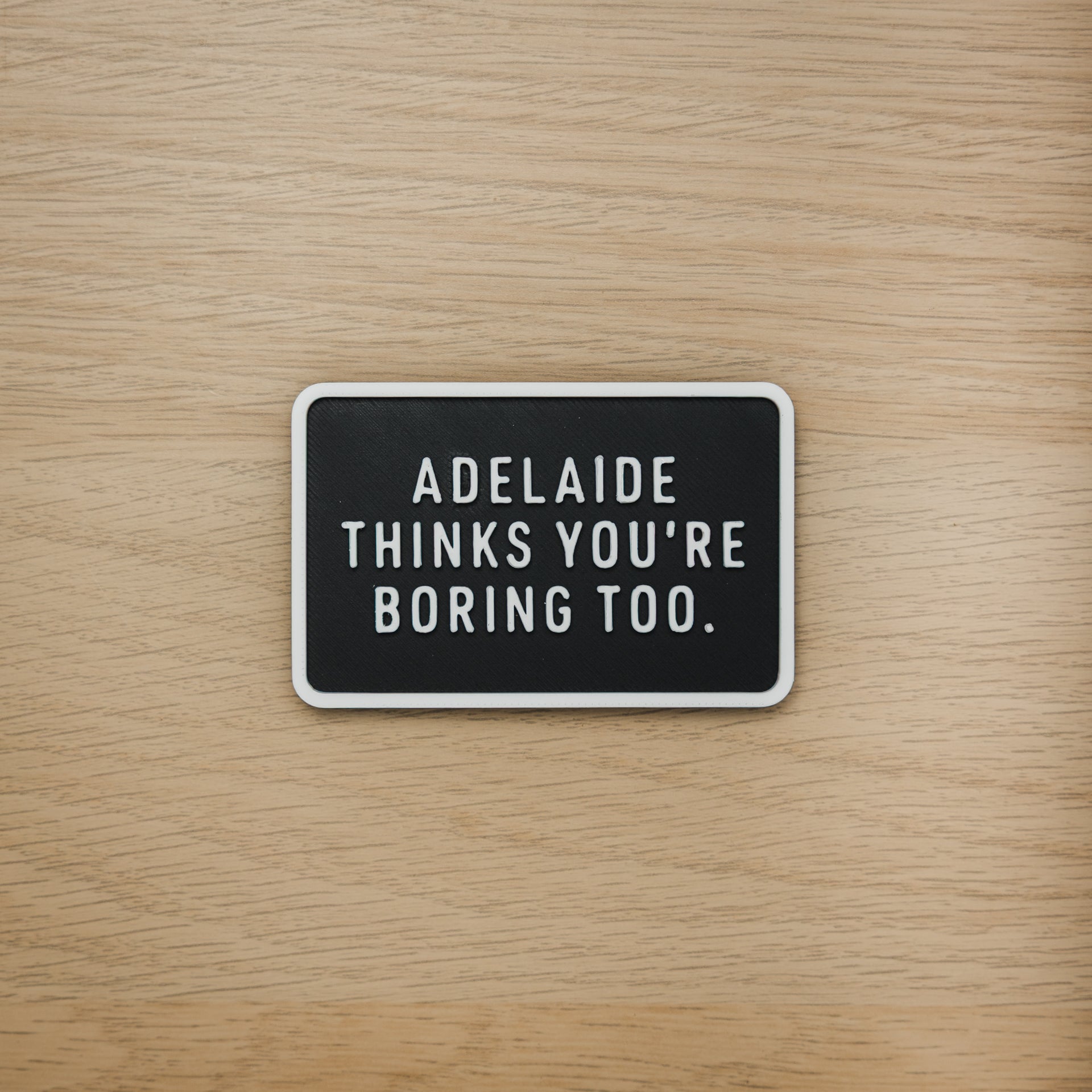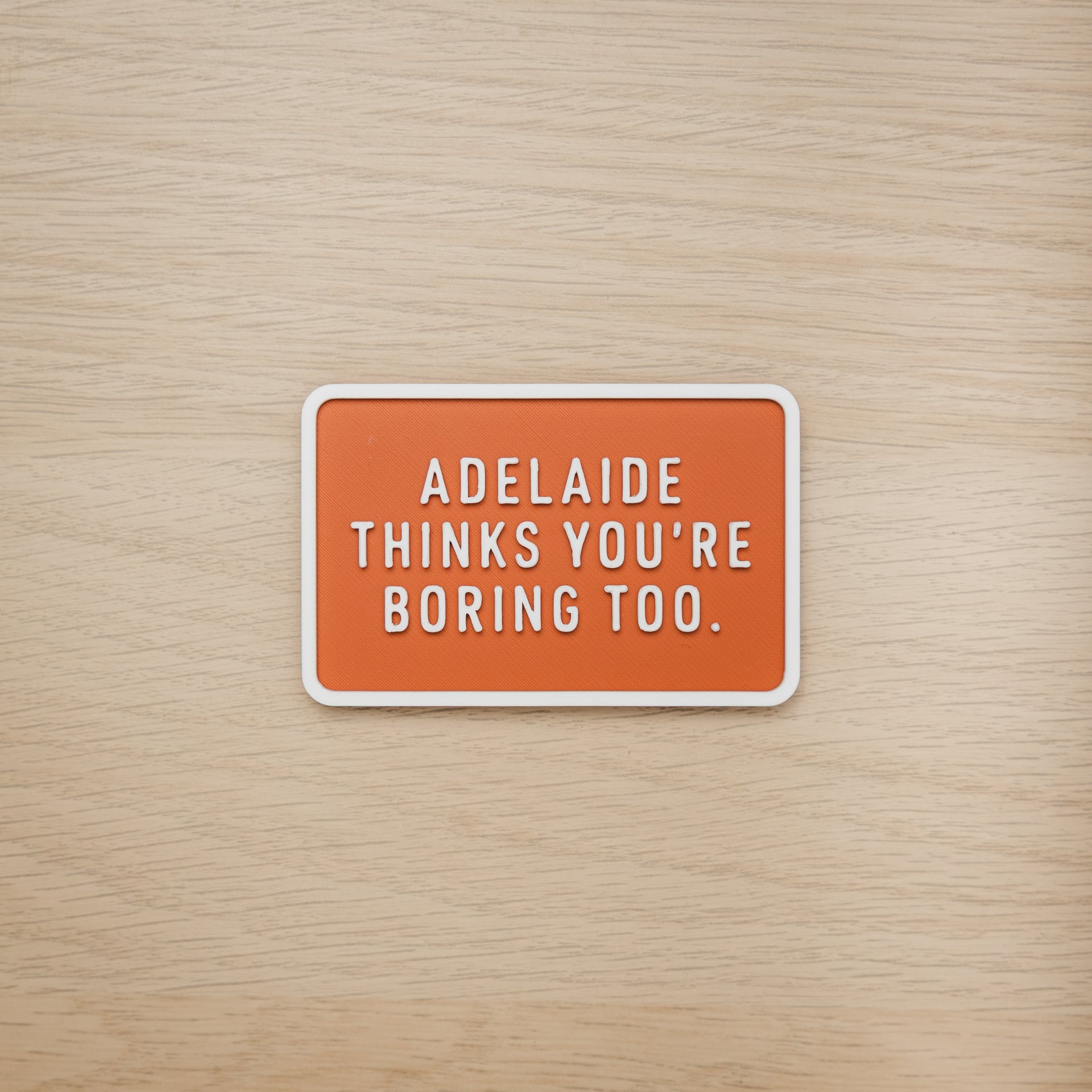 Introducing the Adelaide Thinks You’re Boring Too fridge magnet: the perfect passive-aggressive accessory for your kitchen, cubicle, or anywhere in need of a little dry South Australian sass.