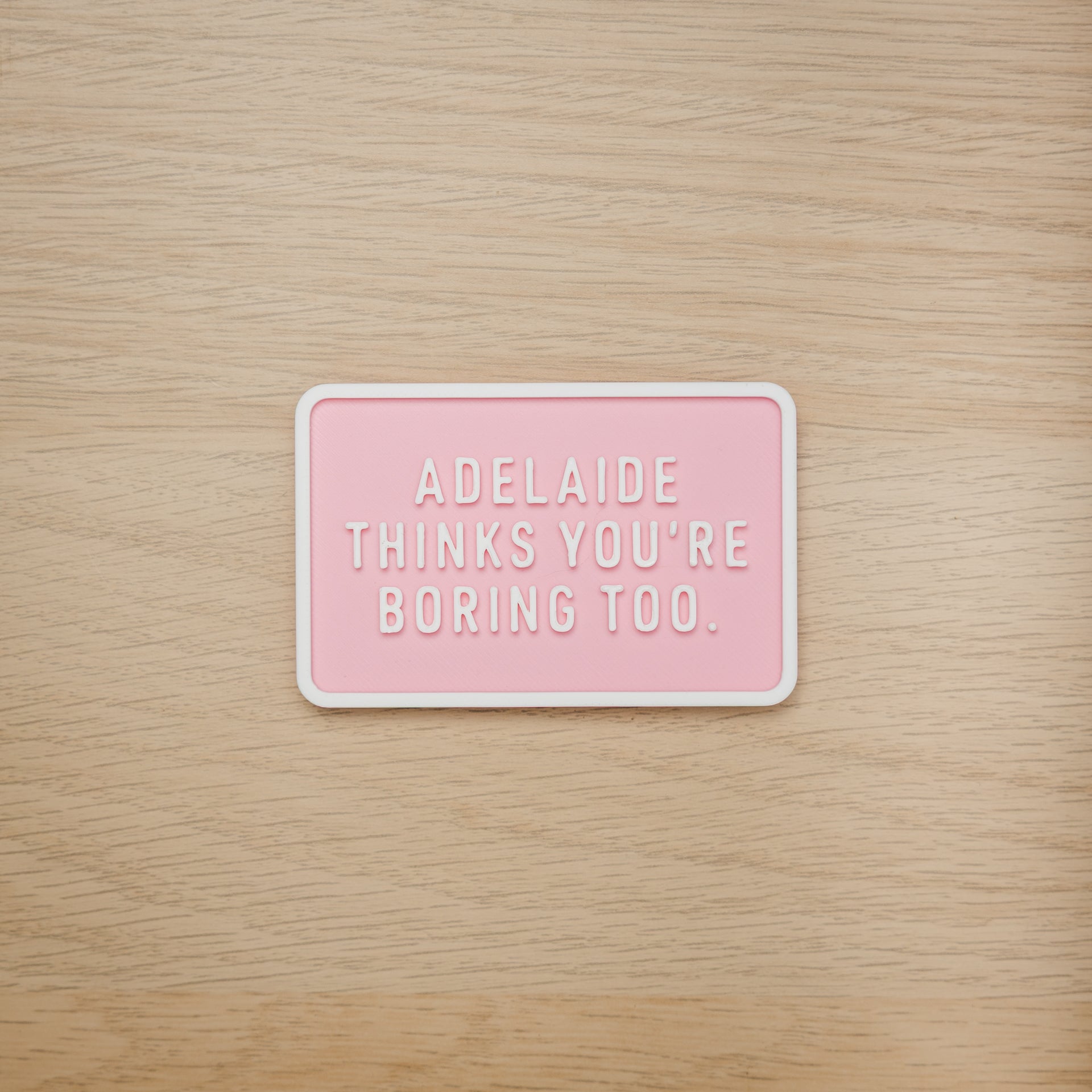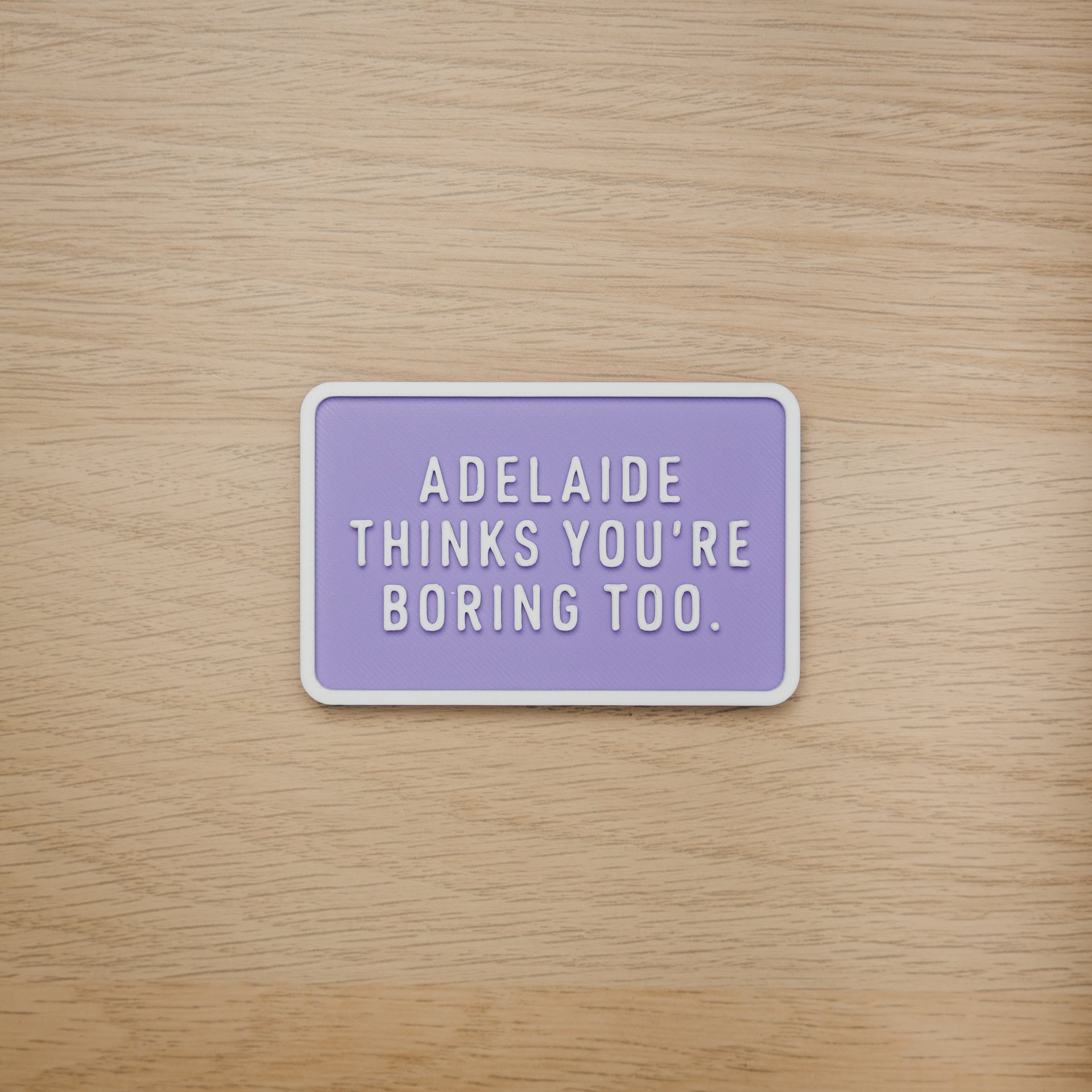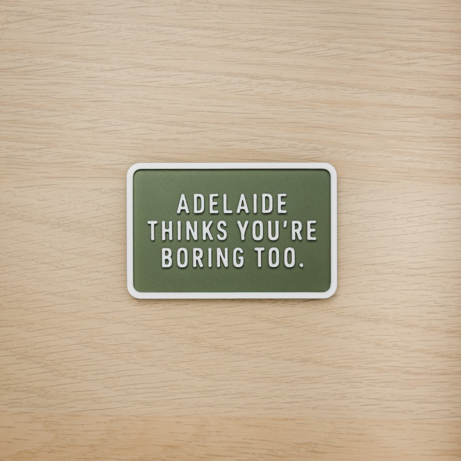 Introducing the Adelaide Thinks You’re Boring Too fridge magnet: the perfect passive-aggressive accessory for your kitchen, cubicle, or anywhere in need of a little dry South Australian sass.