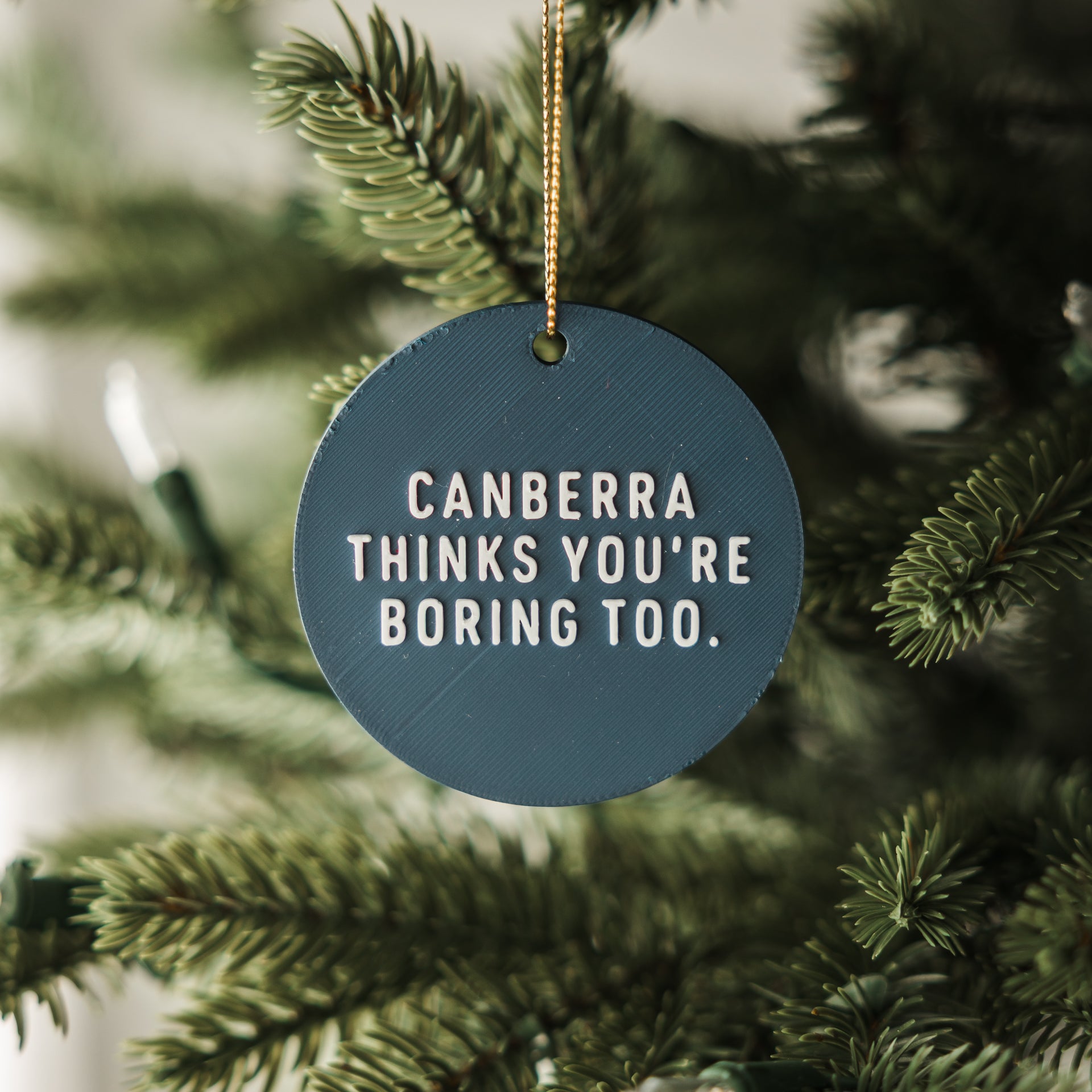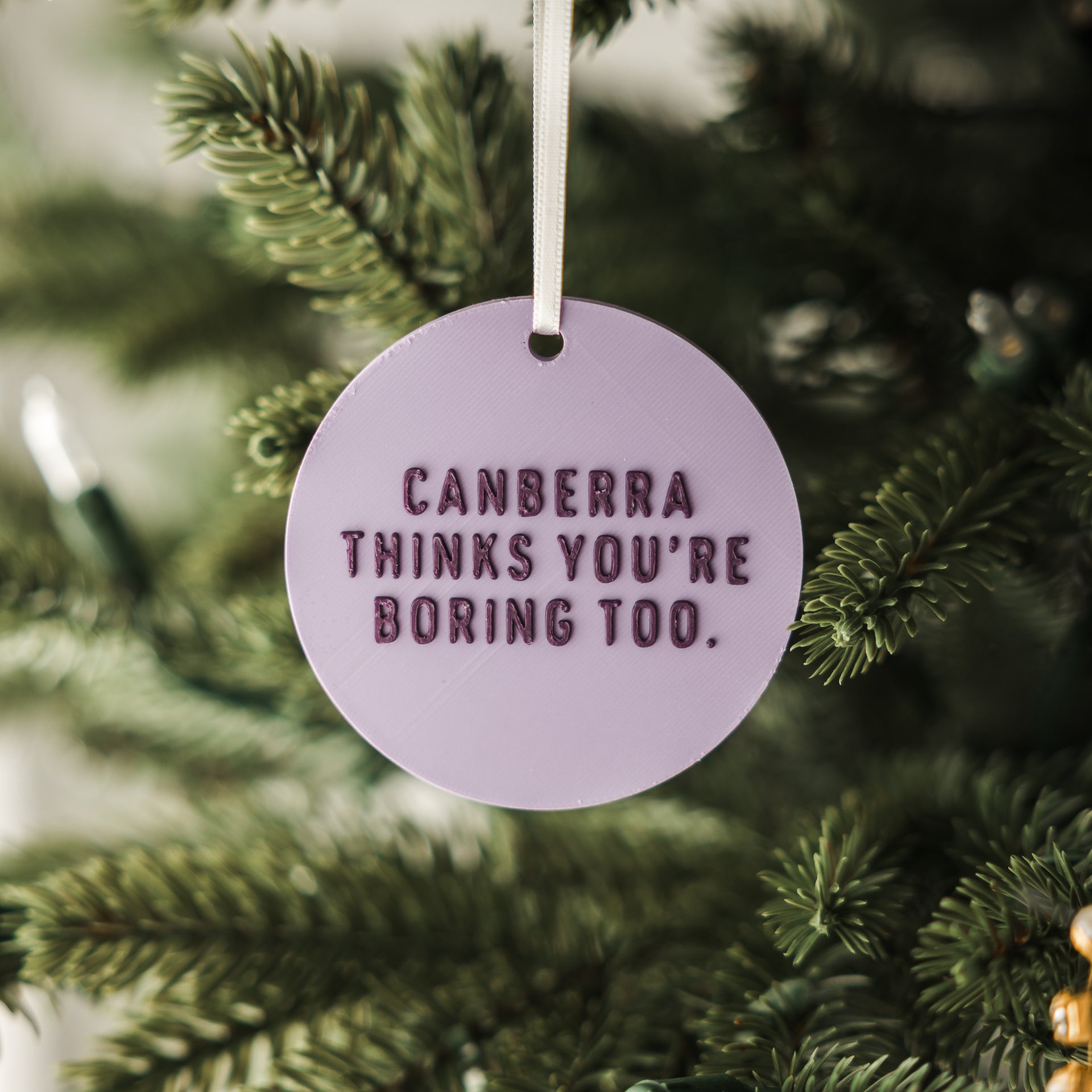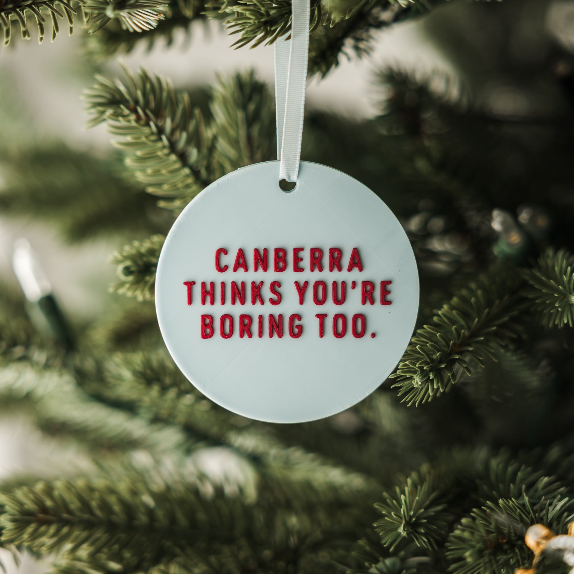 Make your tree as cheeky as your city pride. Our “Canberra Thinks You’re Boring Too” ornament is the perfect mix of festive sparkle and local sass. A love letter to the capital that knows how to laugh at itself.